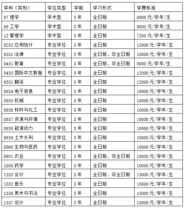 第十三条 所有纳入招生计划的硕士研究生都要缴纳学费,学校按照省物价部门批准并办理收费许可的标准向学生收费,学校收费标准、学制、学位类型、学习形式详见下表,就读校区按学校当年办学布局规划安排。