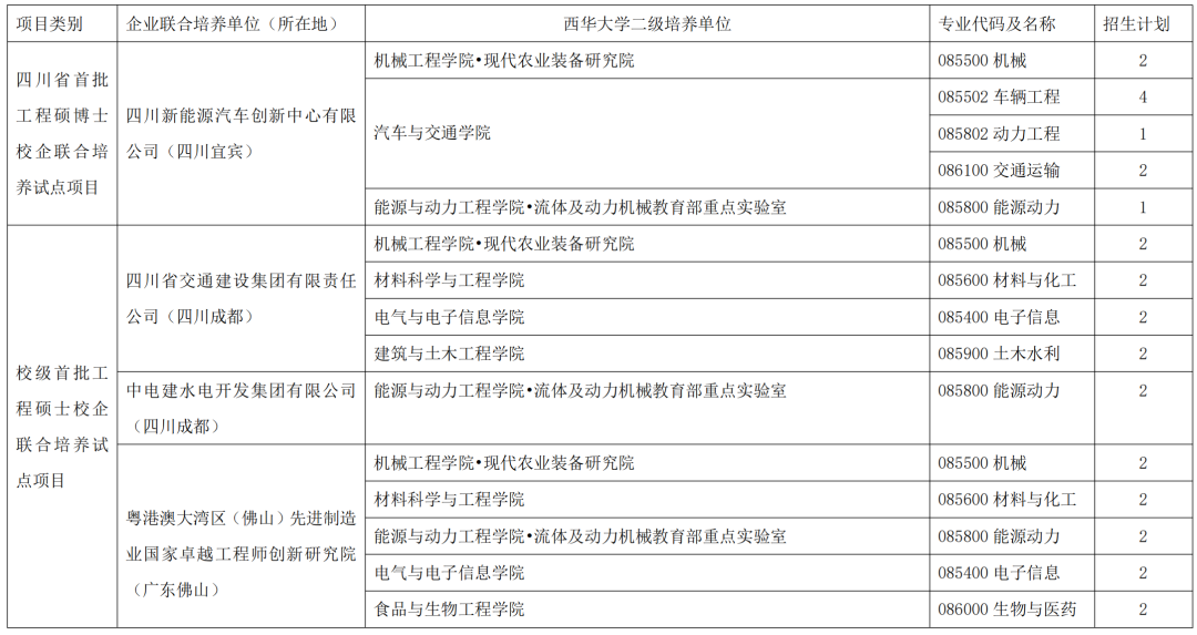 ◈ 为贯彻落实习近平总书记关于“培养大批卓越工程师”的重要指示精神,学校启动“卓越工程师培养综合改革”试点工作,瞄准重大工程产业对高层次人才迫切需求的关键点,精准匹配优势培养单位和优势学科,联合领军企业,采取工学交替模式,就机械(车辆工程)、能源动力(动力工程)、交通运输、材料与化工、电子信息、土木水利、生物与医药七个专业面向产业需求,与国内龙头企业深度合作,开展专业学位研究生培养。所有计划学习方式为全日制,学制3年,一年级在西华大学完成课程学习,剩余时间依托联合培养单位研发项目在校企导师共同指导下完成工程实践和学位论文。具体招生专业及计划见下表。
